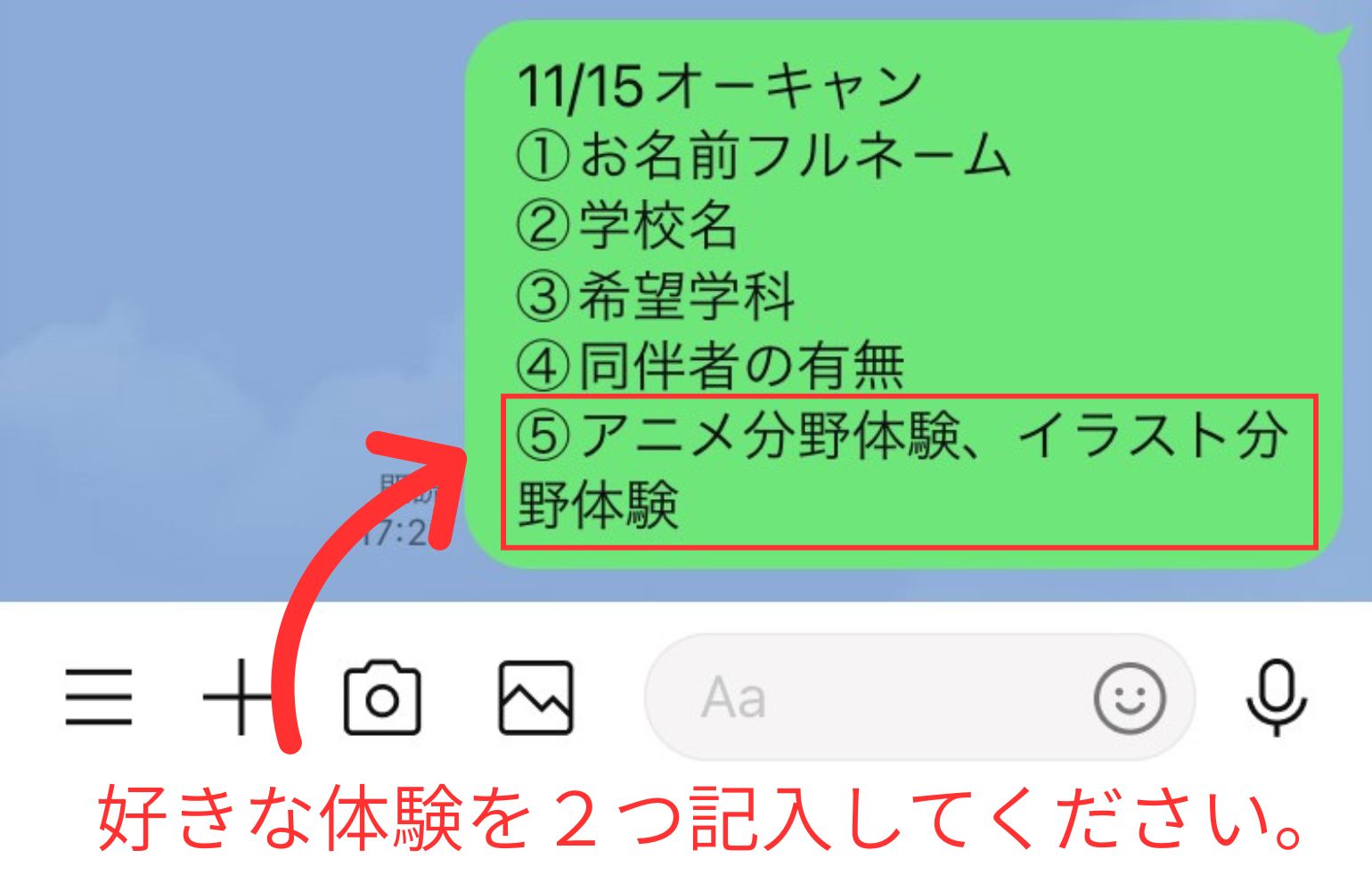②公式LINEからご予約の方は、お好きな体験を2つ記入して送信してください。